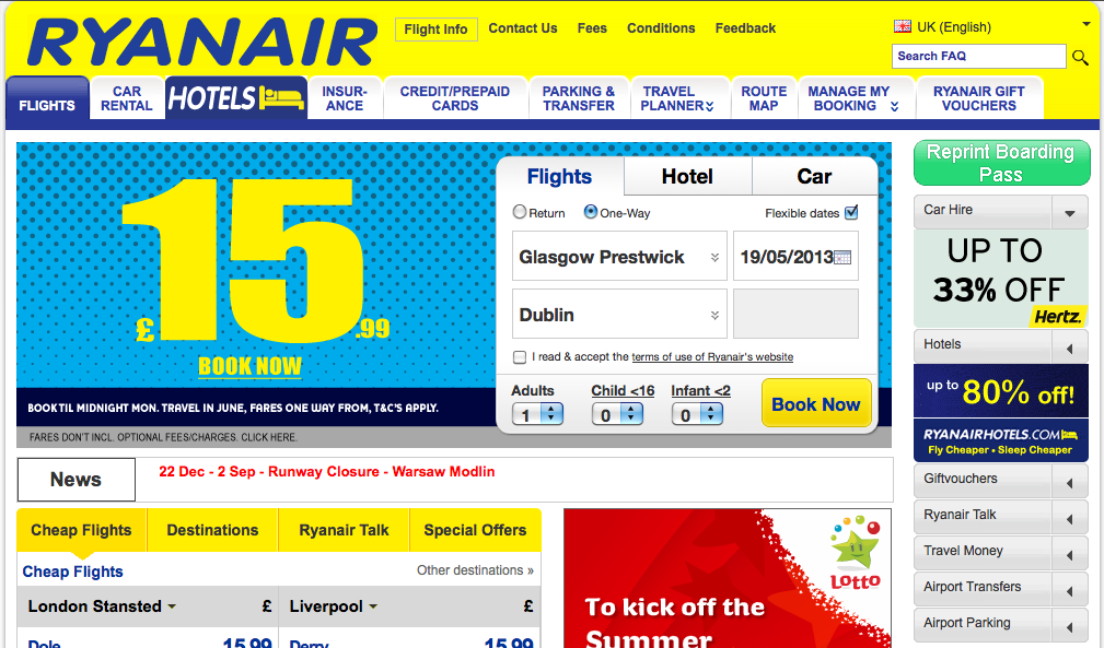 Every time I boarded a flight during our month backpacking (which was 7 times), I felt like I had just pulled off one of the world’s most BA stunts. Airport security is somewhat of a hassle when you’re flying regular airlines, so take those hoops you have to jump through and multiple them by 27. Then you’ll have a relatively accurate perception of who Ryanair is. Before I completely ridicule Ryanair, let it be known that I really do like their company and from a business perspective have analyzed and understand why they do things the way they do. But that doesn’t mean what they do is normal. And it definitely doesn’t mean that their practices aren’t relatively comical. First of all, this is their homepage.
