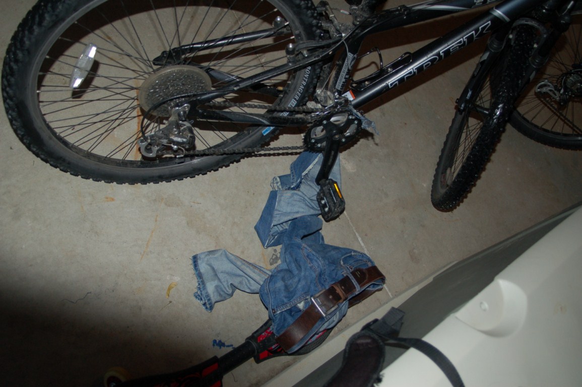 As I was casually scooting along on my bike, all of a sudden I was having trouble pedaling forward. What da heck?! Took me a half second to realize that my pant leg had conveniently gotten wound up in my chain. No big deal.