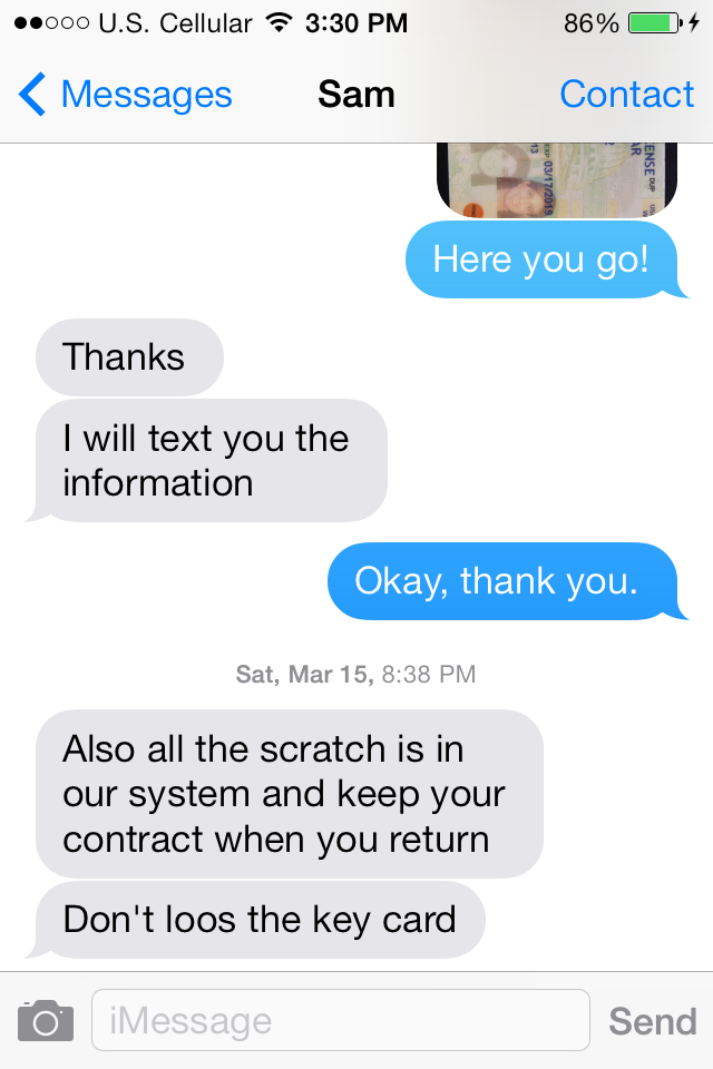 And then we make it to the Crowne. He drops us off and we’re crossing our fingers that some how this whole situation (that adds up to be disastrous) somehow actually isn’t by some miracle. So we open up the video. Which turns out to be incredibly helpful. Leads us right to our car. I was assuming that the RA# was a code to unlock the vehicle. Nope. Unlocked. Keys in the glove compartment along with my one-page contract. My insurance wasn’t through them, but I was covered up to $50,000 because I had done the transaction with my Discover card. Thanks Discover. And anyway, everything was perfect. The car was super nice. 1/4 tank of gas like he said. Smelled brand new. We documented the scratches for our own personal records…and we were off. Easy as pie.