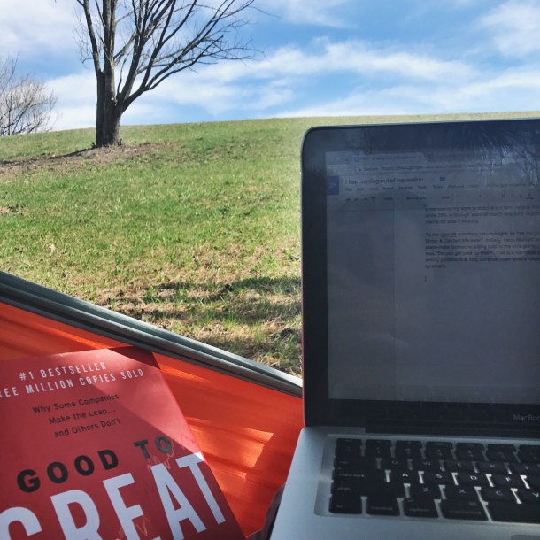 Reading Good to Great, writing this blog, and hammocking on an 80-degree day in April.