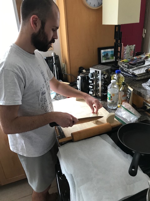 Day 14, Sunday 3/29: Again, I start my day with yoga, followed by cooking. Steve makes homemade corn tortillas and chips with the masa in our cupboard. I can’t figure out why we have this bag of corn flour and he wishes we had a tortilla press, as he uses a rolling pin to flatten the dough balls. When his arms begin to ache, I make hummus. I find an old jar of tahini that has separated into oil and solids. In my struggle to get it out of the can, I cut myself slightly and recover without fainting. Steve bandages me up, a la Chopped kitchen.